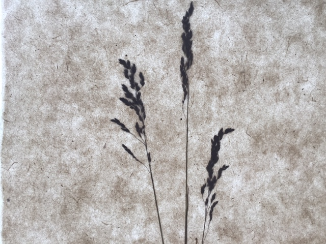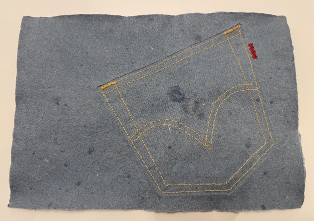 Handgjort A5-papper av mina gamla blåjeans som sedan broderats i reliefen av en ficka. Att brodera på papper går också utmärkt! Det andra pappret har ett inlägg av grässtrån, mellan två tunna papperslager.