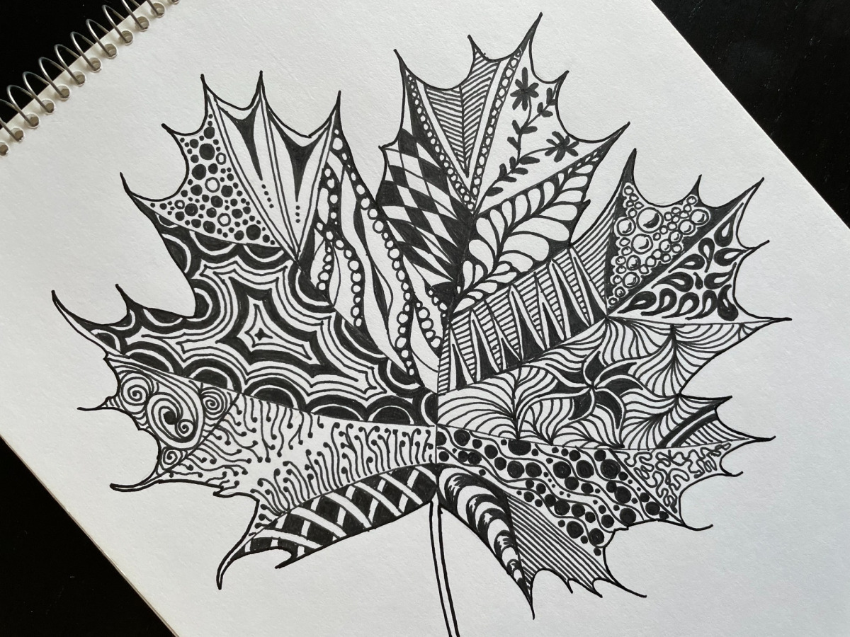 Här har jag ritat av ett lönnlöv och fyllt i med olika mönster med en tunn tuschpenna. Detta kan väl kallas doodles eller bara fantasifulla krumelurer!?