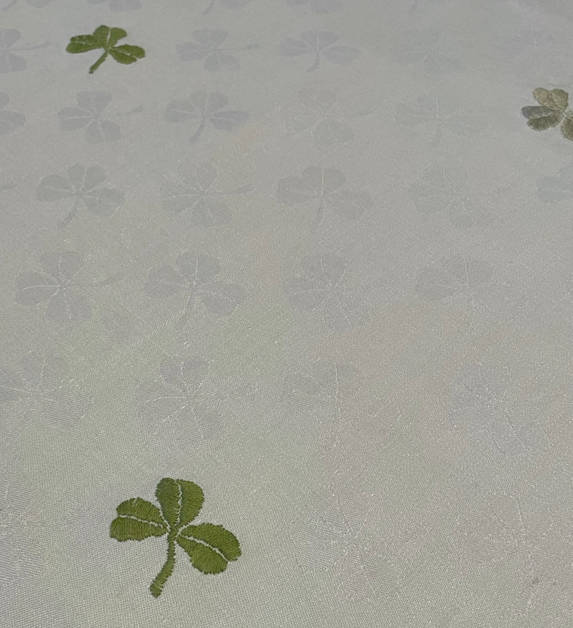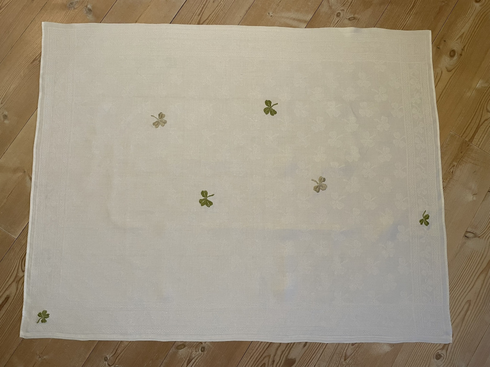 Broderi på vit linneduk (ärvd och fläckfri). Duken är vävd med ett svagt mönster av klöver. Perfekt till sommarens fester! Bladen har broderats i två gröna nyanser. Jag tänkte kuppa in en fyrklöver men hittade en i hörnet!
